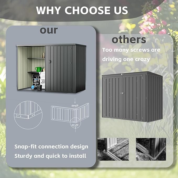 - 🏠【Innovative Snap-Fit Design – Save 30% Time】 No more tedious installation! Our tool shed outdoor storage adopts an innovative snap-fit connection, reduces screws usage, and makes setup faster & easier