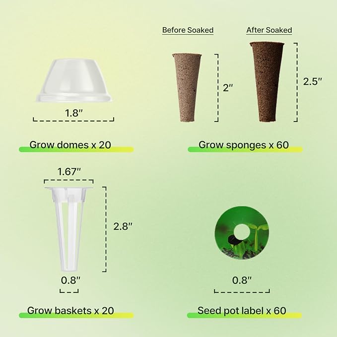 - 160pcs Gardening Supplies: This value-packed set includes essential accessories to kickstart or replenish your hydroponics growing system kit: 20 grow baskets, 60 grow sponges, 20 grow domes, and 60 pod labels—ideal for both beginners and experienced hydroponic growers. Please note: seeds and plant nutrients are not included.