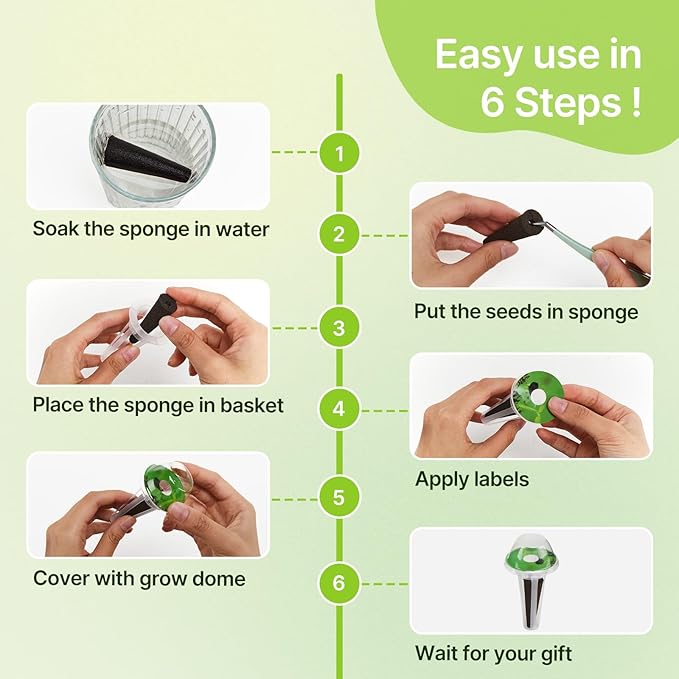 - Easy to Use:Simply insert the sponge into the basket, plant your seeds, and cover with the dome. The included 60 plant support stickers feature a hollow circular design, allowing seedlings to grow through the center while providing gentle support to keep plants upright as they mature.