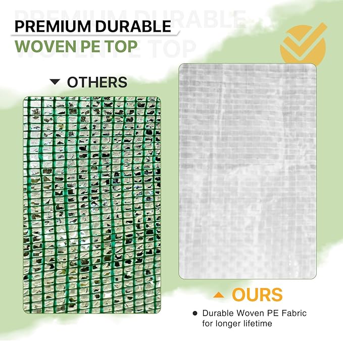 - It is made of durable 150g/sgm woven PE cover with 70% light transmission. This material not only maintains the perfect temperature and moisture for plants but is also durable for long-lasting use.