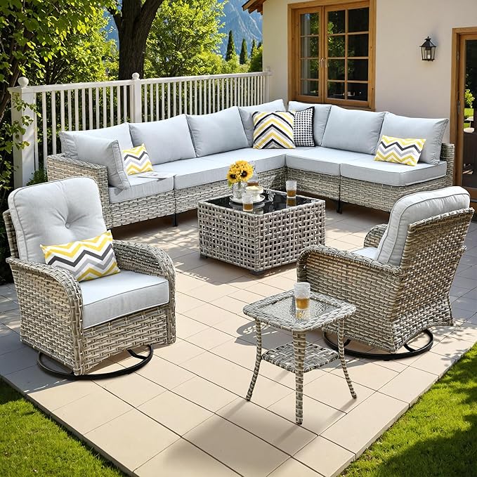 Outdoor Sectional Patio Furniture Set with Swivel Rocking Chairs,10 Pieces Wicker Conversation Sets L Shaped Couch Out Door Sofa Set Outside Furniture for Garden Deck Yard Porch,Grey