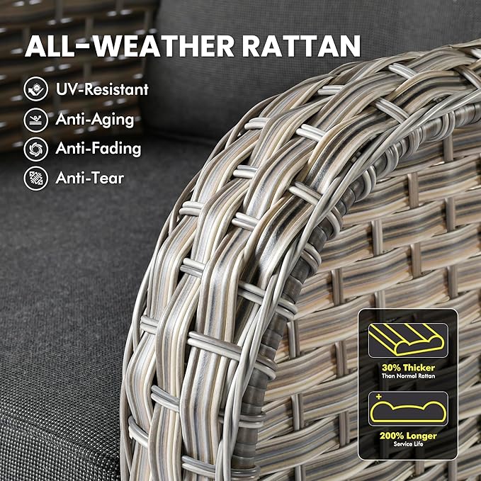 - All-Weather Patio Modular Sectional Sofa Set:Built to last, our All-Weather Patio Modular Sectional Sofa Set is crafted with premium, handwoven PE rattan, designed to withstand rain, snow, and blazing sun. Whether hosting guests or relaxing solo, this patio conversation set — including the outdoor sofa and chair — resists stains and is water-repellent, ensuring effortless maintenance for a pristine backyard oasis