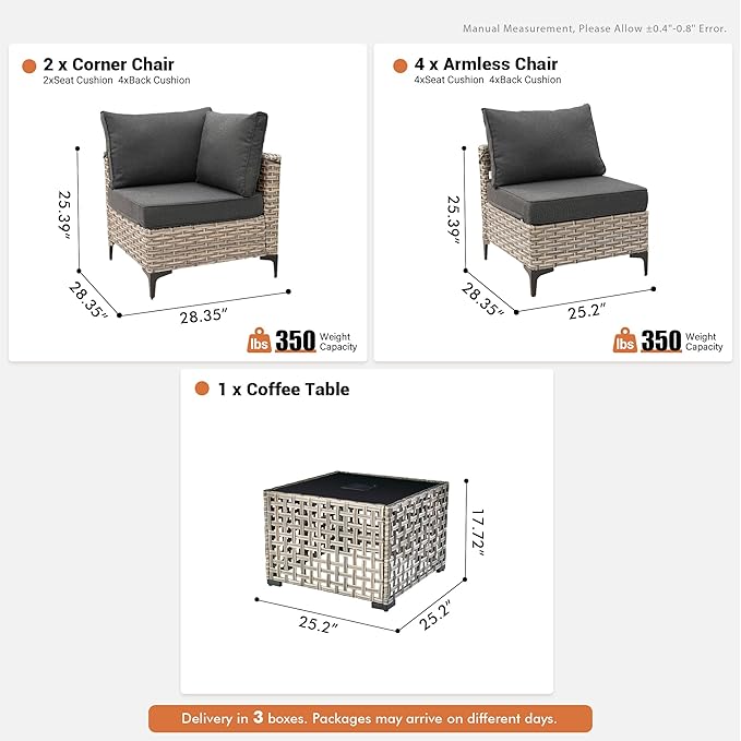 - All-Weather Patio Modular Sectional Sofa Set:Built to last, our All-Weather Patio Modular Sectional Sofa Set is crafted with premium, handwoven PE rattan, designed to withstand rain, snow, and blazing sun. Whether hosting guests or relaxing solo, this patio conversation set — including the outdoor sofa and chair — resists stains and is water-repellent, ensuring effortless maintenance for a pristine backyard oasis