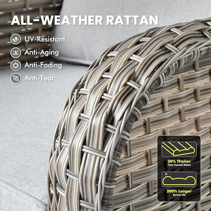 - All-Weather Patio Modular Sectional Sofa Set:Built to last, our All-Weather Patio Modular Sectional Sofa Set is crafted with premium, handwoven PE rattan, designed to withstand rain, snow, and blazing sun. Whether hosting guests or relaxing solo, this patio conversation set — including the outdoor sofa and chair — resists stains and is water-repellent, ensuring effortless maintenance for a pristine backyard oasis