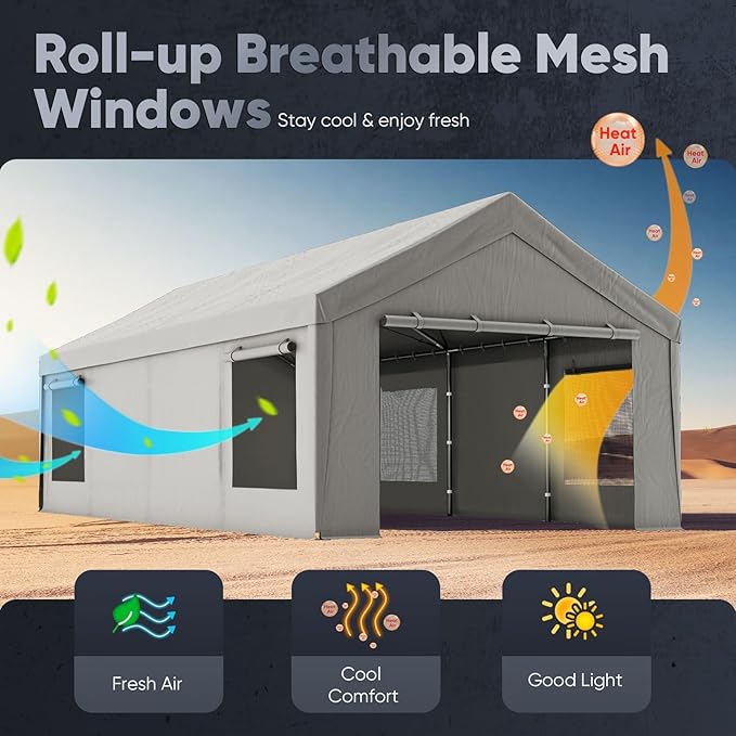 - 【Convenient Roll-Up Side Doors】This heavy duty car canopy features roll-up zipper doors on each side panel, in addition to the front and rear zipper doors, allowing for easy access from multiple directions. Ideal for parking ATVs, motorcycles, RVs, lawn mowers, and frequent-use storage.