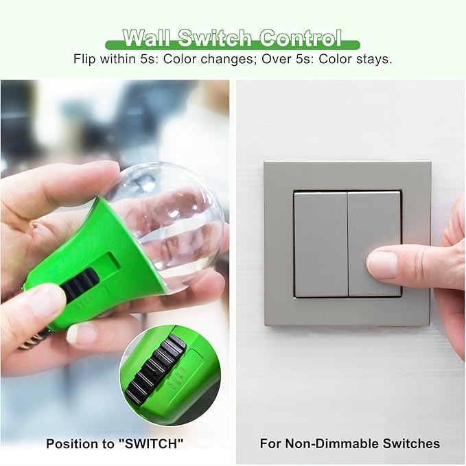 - 【Wall Switch Control】 Set the bulb to SWITCH mode, easily cycle through the different light modes using a standard wall switch to control it for each stage of plant growth—no smart devices or apps needed. Turn it back on within 5 seconds to change the color. If exceeds 5s, the color stay.