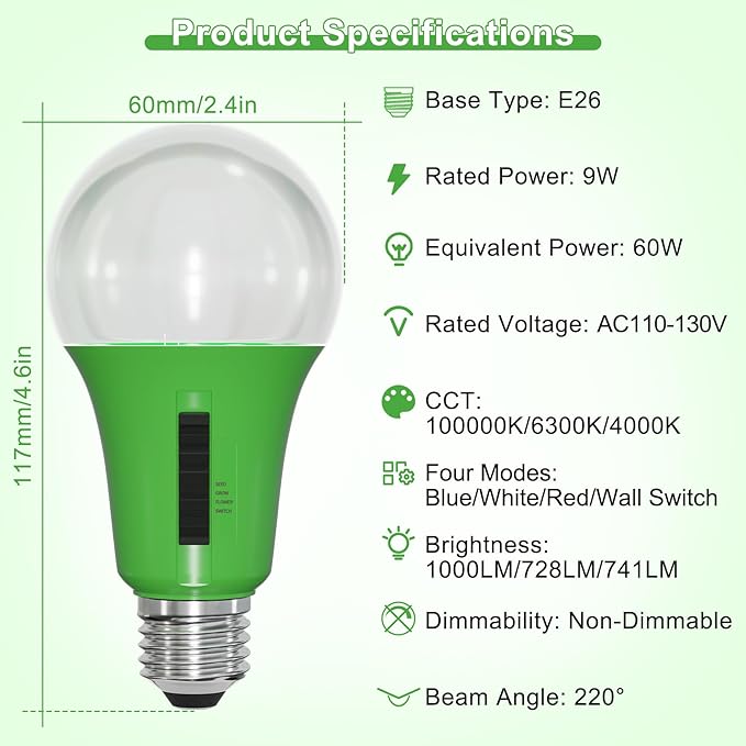 - 【4 Modes for Every Stage】 This A19 LED grow bulb features 4 modes—Blue (SEED), White (GROW), Red (FLOWER), and Wall Switch. Easily toggle modes with a standard switch to support every growth stage, from seedlings to flowering.