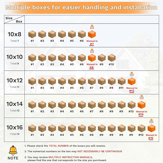 - Note: 1. Please check the policies of your community's homeowners association (HOA) to ensure that this project complies with relevant regulations. 2. The storage shed will be divided into 9 packages, numbered 1, 2, 3, 4, 5, 6, 8, 9, and 10, excluding package 7, which may be delivered in batches. You can scan the QR code on the package or contact us for information about other packages.