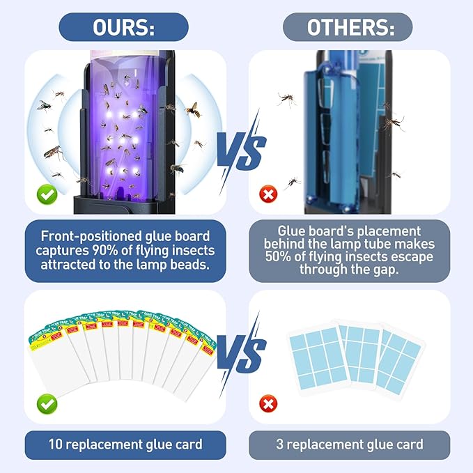 - 【Upgraded Fly Trap Indoor】Traditional fly traps have flaws: lamp-post type designs lose 50% capture rate due to gaps, while bottom-upward light types waste 50% of the divergent light. Our solution adds 9 LED lamp beads on the back-panel that diffuse puncture light onto a transparent glue board, so that the flying insects 90% can be trapped on the transparent glue board by the puncture light.