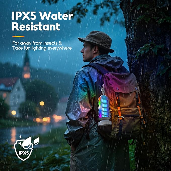 - PORTABLE, LIGHTWEIGHT, IPX5 WATERPROOF - This fly zapper is wireless and compact enough to move between rooms, it comes with a rubber hook a hang just about anywhere - from ceiling to tent poles. The IPX5 waterproof design ensures it can withstand the elements, making it a reliable companion for any outdoor adventure. A very useful tool when go camping, both in dealing with bugs inside the tent and its usefulness as a lantern because of the other light functions