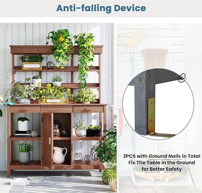 - 【Built-In Stability & Safety】: Garden anywhere with confidence! Uneven ground is no problem for this potting bench. We've included an anti-tipping device to easily secure the bench to a wall, ensuring stability and safety, even on slightly uneven surfaces. Focus on your gardening, not on wobbling furniture!