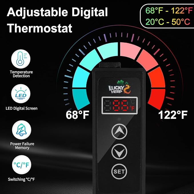 - Intelligent PID Thermostat: Reptile heating pad is equipped with a thermostat that adjusts and maintains the reptile's favourite temperature from 20°C to 50°C (68°F to 122°F), catering for a wide range of reptiles. Switch between °C and °F at any time.
