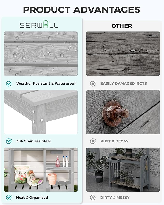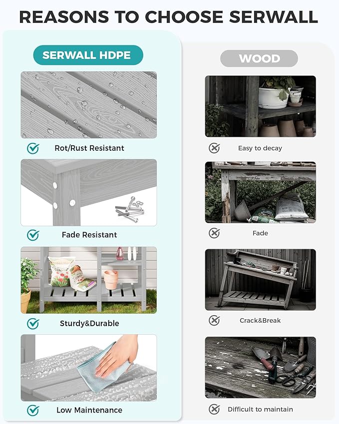 - HDPE Material: Constructed from 100% HDPE material, the SERWALL outdoor potting bench offers high strength and stability, ensuring a long service life. Potting bench table is durable for outdoor use in any weather condition.