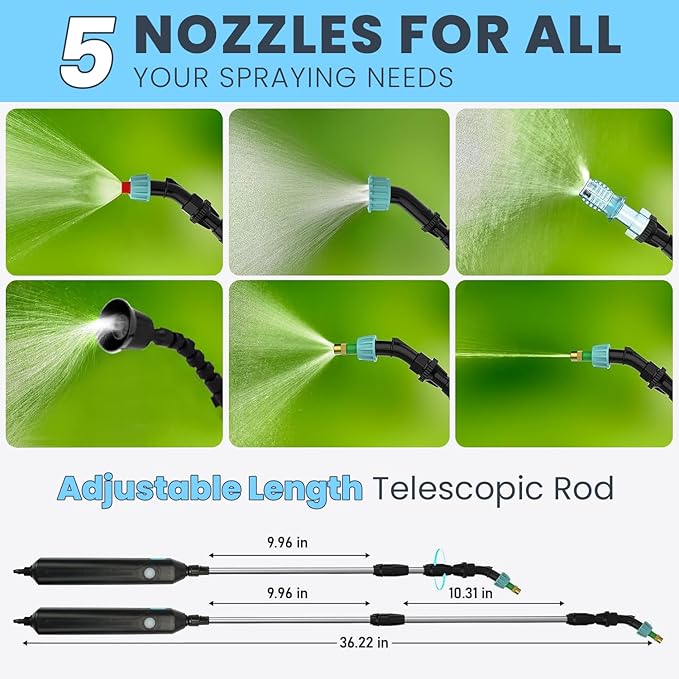 - 【5 Adjustable Nozzles】This battery pump sprayer equipped with 5 nozzles delivering versatile spray patterns: shower, fan, and adjustable direction patterns, allowing you to switch between a fine mist or direct spray to meet the needs of delicate plants or large lawns. making backpack sprayers ideal for extended use in diverse lawn care and agricultural applications while maintaining workflow efficiency.