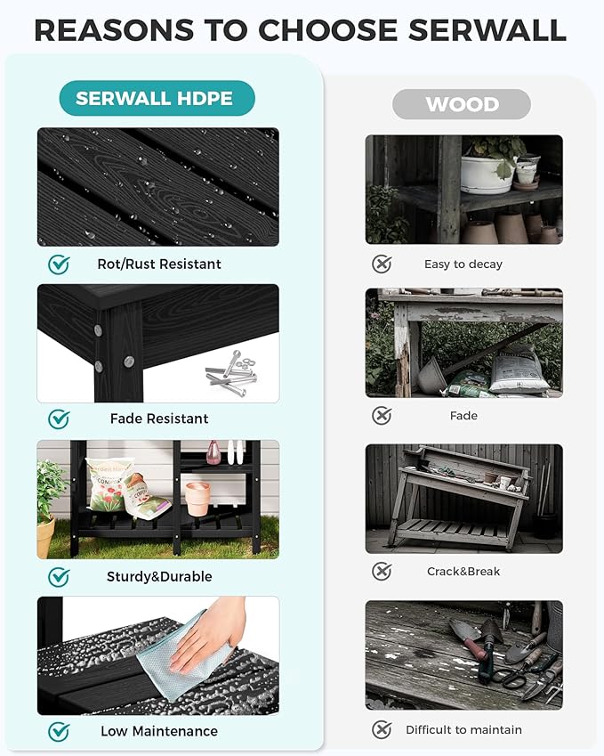 - HDPE Material: Constructed from 100% HDPE material, the SERWALL outdoor potting bench offers high strength and stability, ensuring a long service life. Potting bench table is durable for outdoor use in any weather condition.
