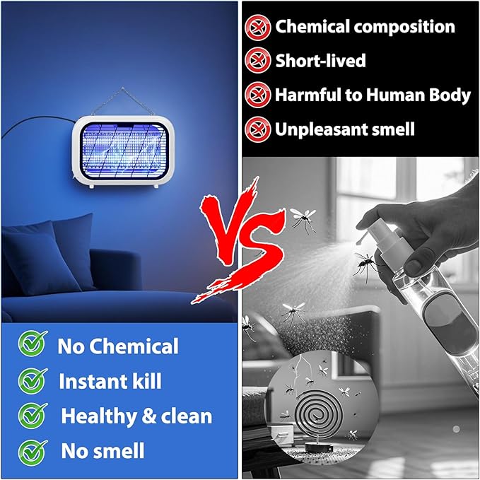 - Simple to Use: This indoor bug zapper comes with an extra chain, allowing you to hang it anywhere on a hook or place it on a flat surface where the bugs hangout. Plug it into a socket, simply turn on/off switch for hassle-free use.