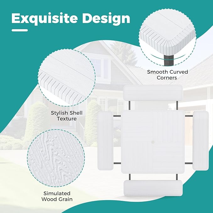 - Exquisite Craftsmanship: The tabletop and seats feature a realistic wood grain finish and chic shell texture that enhance the visual appeal. Therefore, the camping table with benches is a charming addition to your poolside, deck, restaurant or garden.
