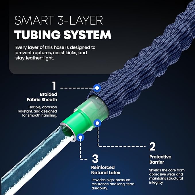 - [Universally Compatible Kink-Free Design] Engineered with standard 3/4" GHT, corrosion free, pure brass connectors, our hose fits a wide array of faucets nozzles and accessories. The ultra flexible, never kinking design contributes to a hassle-free watering experience. The triple layer construction provides a durable and manageable garden hose with dependable performance in various weather conditions.