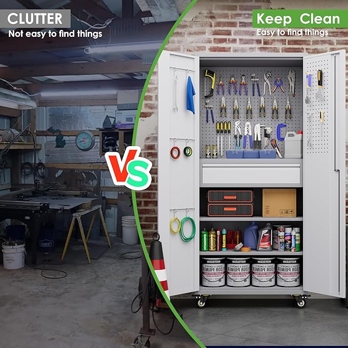 - Perfect Design:Garage storage cabinet with wheels is designed with 2 adjustable shelves,can be adjusted according to your needs.Rolling tool cabinet has a drawer which can store some valuable things