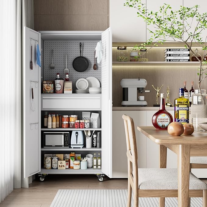 - New Upgraded:The Metal storage cabinet is designed with holes on the back and door. we send you 4 hooks,You can arrange it according to your needs.what's more,it has 3 rods to hang something