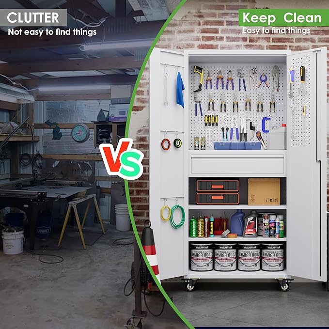 - Perfect Design:Garage storage cabinet with wheels is designed with 2 adjustable shelves,can be adjusted according to your needs.Rolling tool cabinet has a drawer which can store some valuable things.