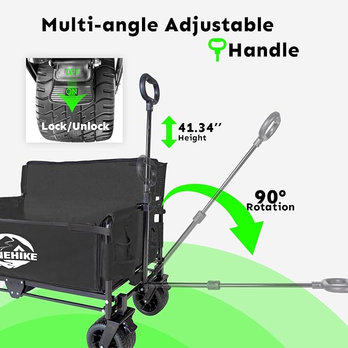 - 【360°WHEELS & FLEXIBLE HANDLE】This wagon seat is equipped with 360° rotation wheels and a brake system. The convertible wagon bench seat features an extended 28.74 to 41.34 inch adjustable handle for one-handed control, ensuring smooth and safe movement across various terrains like dirt and grass.