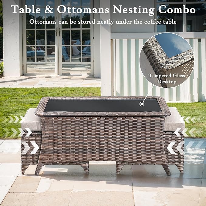 - 【Outdoor Furniture Set】8 PCS Patio Furniture Set includes: 4 swivel patio chairs + 1 sofa + 2 ottoman + 1 coffee table. From compact patio setups to large poolside patio or yard, our outdoor furniture adapts to any space to create comfort and cohesive leisure areas.