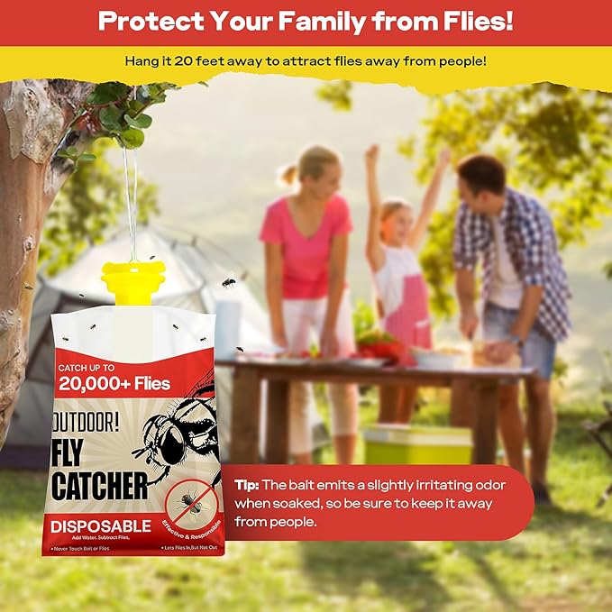 - [Natural Bait Outdoor Fly Traps] This fly traps uses natural fly food as bait. With the odor as bait, flies are iresistibly attracted to it. flies enter the trap through the top flap of the fly trap bag and drown in the water. (includes 20 grams x 9 bags) Tips: Too much bait can give off an unpleasant odor! 20 grams of bait kils approximately 20,000+ flies, so please be careful how much you use in your fly traps.