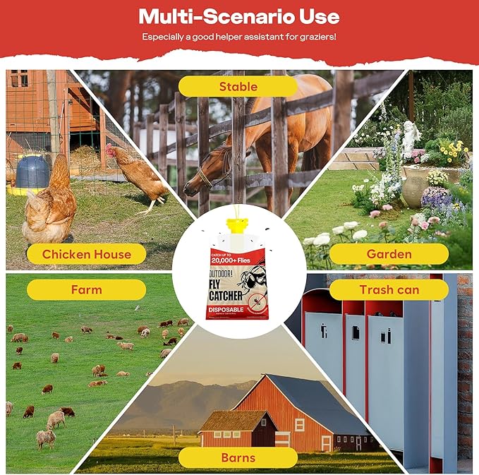 - [Disposable Non-Toxic Fly Traps] Our fly traps are made of natural bait, containing only fish, eggs and wheat bran, which are safe for animals to eat, so there is no need to worry about pets or dogs accidentally eating them. After the fly bag container is full, you can also easily tear open the bag and pour out the dead flies to feed your poultry. Or just wrap it up in a garbage bag and throw it away, it doesn't take up space and you don't have to worry about safety & mess.