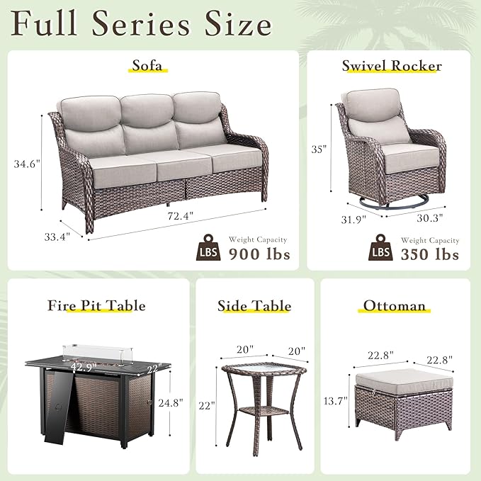 - 【Patio Set with Fire Pit Table】9 PCS Patio Furniture Set includes: 4 swivel patio chairs + 1 sofa + 2 ottoman + 1 side table + a 43" rectangle fire pit table. From compact patio setups to large poolside patio or yard, our outdoor furniture adapts to any space to create comfort and cohesive leisure areas.