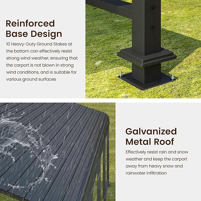 - 【Upgraded Roof】The carport canopy is made from 0.25mm high-strength alloy iron sheet, with a protective film applied to the surface. It is equipped with upgraded high-density weather-resistant sealing tape, which prevents leaks and provides excellent protection against rain and wind. The high-peak design offers greater storage space, accommodating taller and wider vehicles or equipment.