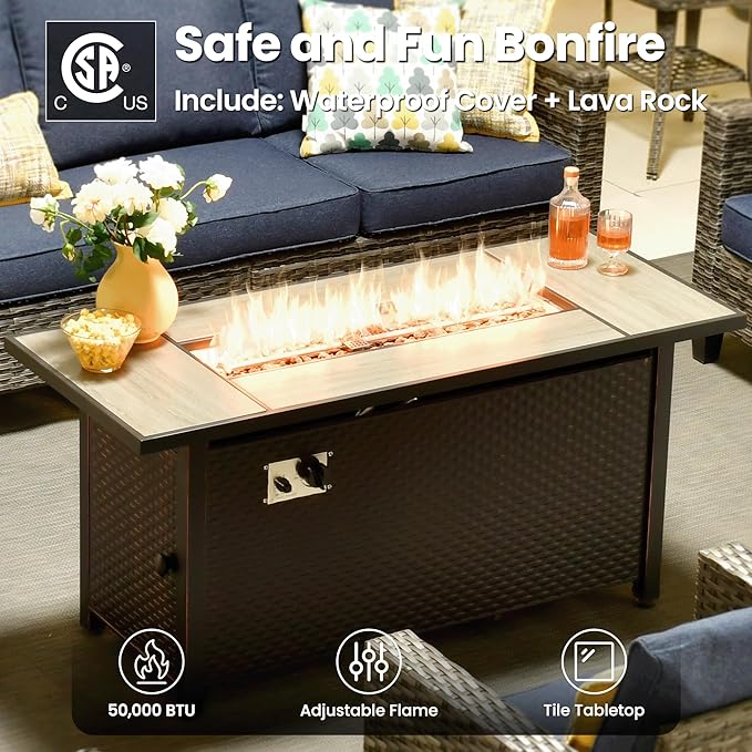 - Outdoor Fire Pit Table: Patio gas propane fire table has 55000 BTU of heat output with CSA certification. Features a safe ignition system, adjustable flame control, and a user-friendly switch panel for effortless operation, perfect for bonfire night, backyard party, outdoor dining, poolside relaxation, campfire and cool evenings