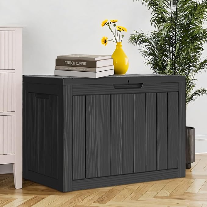 - Durable & Resin Wood-grain: All-weather outdoor environment--A service life of many years. High-density UV-resistant resin and wood-grain finish, this deck box has excellent ultraviolet protection and waterproof ability