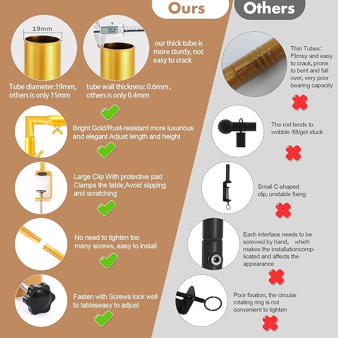 - Easy to assemble: No need to screw in too many screws, just rotate the tube to connect. Follow the included manual to easily complete the assembly. Clamp the table rod stand on the table and adjust the appropriate length and height as needed.