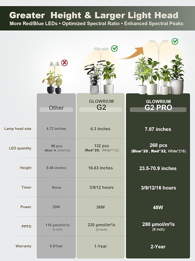 - 【FULL SPECTRUM FOR ALL GROWTH STAGES】: Mimic natural sunlight with our 48W dual-head LED grow light featuring 268 high-efficiency LEDs. Tailor the light with dedicated Seedling (S), Vegetative (V), and Flowering (F) spectrum modes to provide optimal wavelengths for every phase, ensuring robust roots, lush foliage, and abundant blooms.