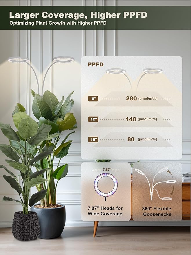 - 【MAXIMUM COVERAGE & FLEXIBILITY】(70.9" TALL): Our floor-standing plant lamp reaches an impressive 70.9 inches, perfect for taller plants and wider coverage. Each 7.87-inch lamp head features an independent 360° flexible gooseneck, allowing you to position light precisely. The sturdy metal base (5.29lb) and premium aluminum pole ensure excellent stability.