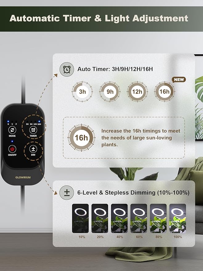 - 【SMART TIMER & PRECISION DIMMING】: Automate your plant care with the built-in timer (3H, 9H, 12H, 16H cycles). Fine-tune brightness with 6 preset levels (10% to 100%) or use the press-and-hold stepless dimming for the perfect intensity. The intuitive controller also includes one-touch ON/OFF and a 5s reset function.
