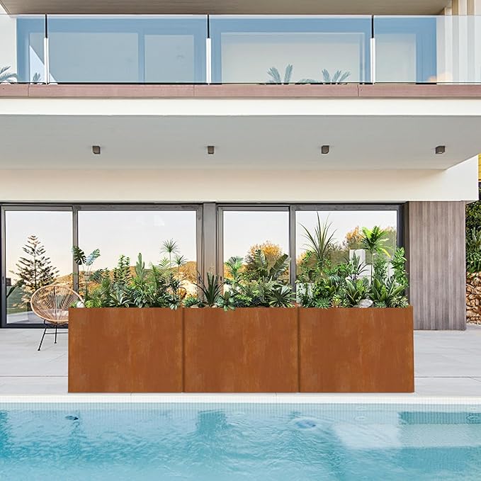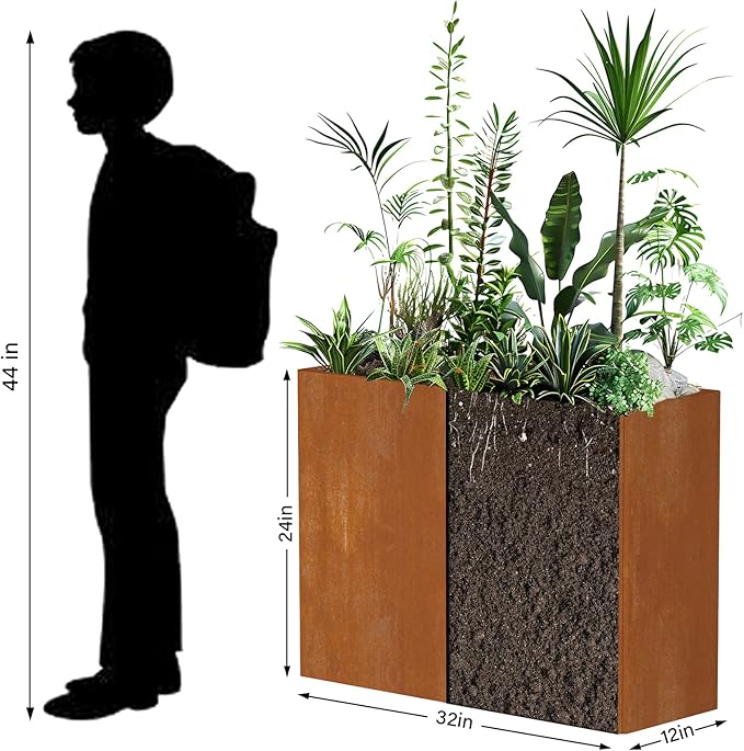 - Metal planter box for Outdoor Plants: Made from Cor ten steel, a high-phosphorus copper-chromium-nickel alloy, forming a stable rust-like patina that protects against further degradation