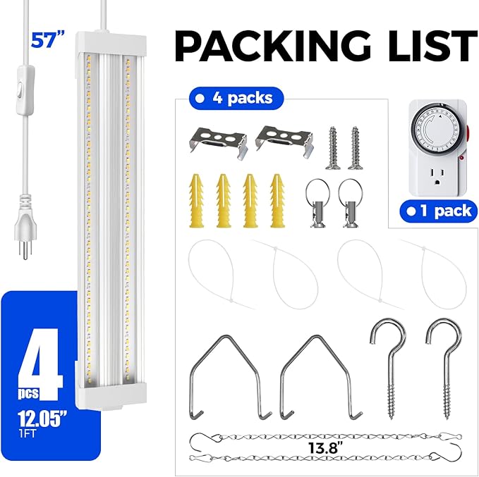 Barrina TX18 1FT Grow Light, 72W(4 x 18W, 360W Equivalent), High PPFD, Full Spectrum with 660nm Red LEDs, Grow Light Strip for Indoor Plants with On/Off Switch, Mechanical Timer, Linkable, 4 Packs