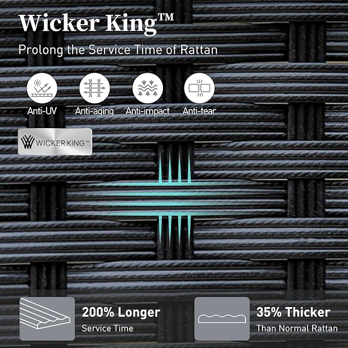 - WICKER KING RATTAN: The premium rattan has 100% UV protection, which is 35% thicker than normal rattan and can provide 200% longer service time. With this 100% handcrafted high quality rattan, this dining set has great performance in all weather like rain, intense sun exposure, suit for year-round outdoor use