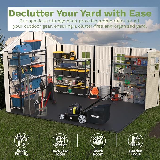 - All-Season Security: Lockable double doors and reinforced resin shield valuables from weather and intruders. Waterproof construction and UV-resistant materials defend against rain, humidity, and fading.