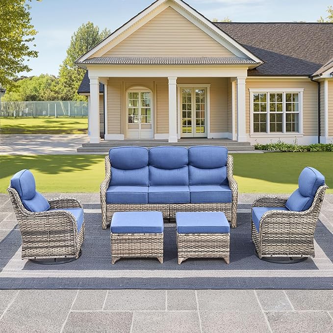 Luxury High Back Outdoor Furniture with 6-Inch Thick Cushions, Patio Furniture Set with Swivel Chairs, 5 PCS Wicker Conversation Set for Porch, Balcony, Deck and Yard