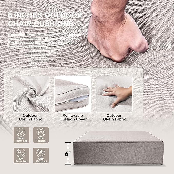 - Premium Thickened Cushion:Our outdoor Patio Furniture Set comes equipped with 6 inches high-density foam cores – ensuring cloud-like comfort and rivaling premium indoor mattresses. The fade-proof and water repellent OLEFIN fabric covers withstand all-weather condition and frequent use while easily maintaining patio furniture elegance.