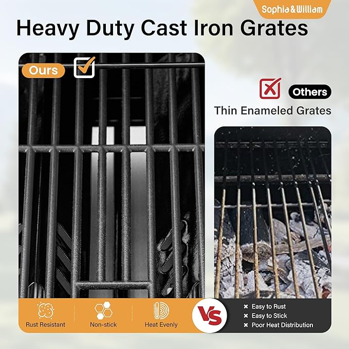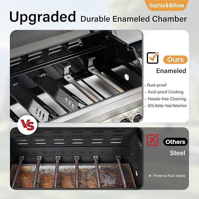 - ๐๐๐ฎ๐น-๐๐๐ป๐ฐ๐๐ถ๐ผ๐ป ๐ฃ๐ผ๐ฟ๐ฐ๐ฒ๐น๐ฎ๐ถ๐ป-๐๐ป๐ฎ๐บ๐ฒ๐น๐ฒ๐ฑ ๐๐ฎ๐๐ ๐๐ฟ๐ผ๐ป ๐๐ฟ๐ฎ๐๐ฒ๐: Sophia & William 6-burner gas grill features innovative grill griddle combo grates, offering authentic sear marks on one side and a flat-top cooking surface on the other. Made from heavy-duty cast iron for superior heat retention, the reversible design provides ultimate versatility - perfect for steaks, burgers, pancakes, and stir-fry. Enjoy professional results and effortless cleanup with this all-in-one outdoor cooking solution