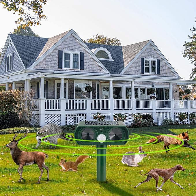 - Effective & Drive Animals Away in a Humane Way: Ultrasonic animal deterrent has a built-in motion detection system, which can detect motion and send out powerful ultrasound and LED red light, making animals uncomfortable to drive animals humanely, but will not cause any harm to human body.No traps, no dead animals