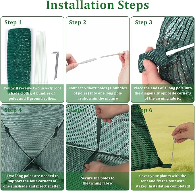 - Easy Use: The green plant shade tent is easy to assemble, you can follow the installation tips to install the netting. Please note: insert one pole into the corner pocket first before connecting the other poles, so that the poles will not fall apart easily during installation.