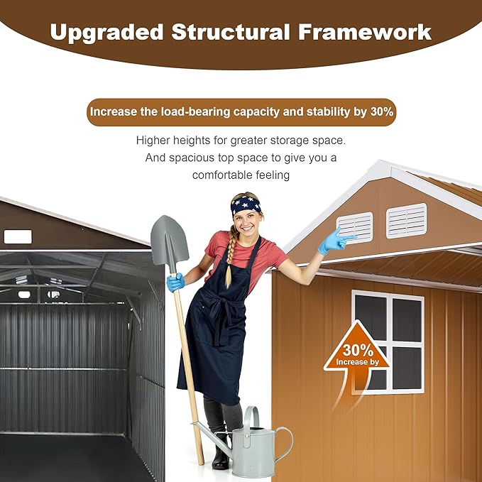 - Heavy-Duty Construction: This shed features galvanized iron panels with enhanced structural support for long-term outdoor use. The reinforced frame is designed to endure common outdoor elements.