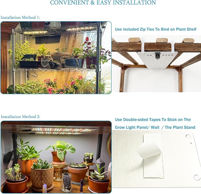 - EASY INSTALLATION: grow lamp size of 11.8 inx 3.15 in and is made of pure aluminum alloy, providing better heat dissipation performance. Suitable for various scenarios, the installation method is easy, saves space, beautify space. Hanging growth lights can greatly improve light coverage and plant efficiency,such as plant stands, walls, cabinets, etc