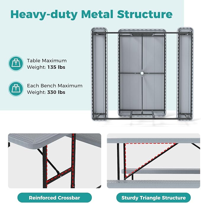 - [Selected HDPE Material]: Boasting HDPE bench surface and tabletop, the picnic table bench set is easy to maintain with a simple wipe. More than that, the impact-resistant and non-fading HDPE is built-to last.