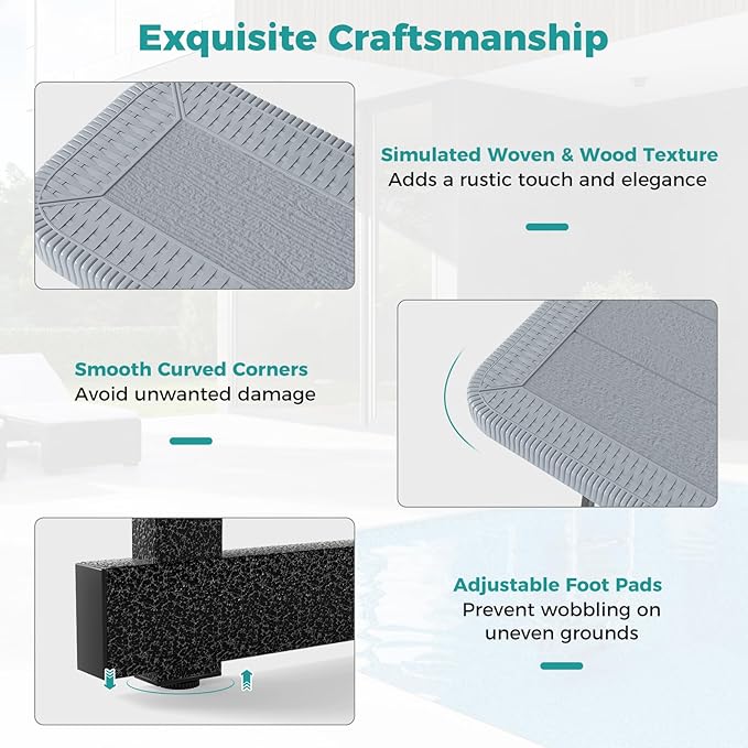 - [Exquisite Craftsmanship]: The tabletop and seats feature a rustic wood grain finish and elegant woven texture that enhance the visual appeal. Therefore, the camping table with benches are perfect addition to your poolside, deck, restaurant or garden.